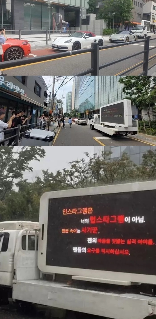 トラックの電光掲示板には、「ジョシュア、初心を守れないのであれば地下室にお帰りください」「PLEDISはジョシュアのすべての活動を中断しなさい」などメッセージが。他にも「インスタグラムはお前のラブスタグラムではない」「ファンを騙す詐欺師」「ファンの心を踏みにじる失格アイドル」といった文句が映し出された。