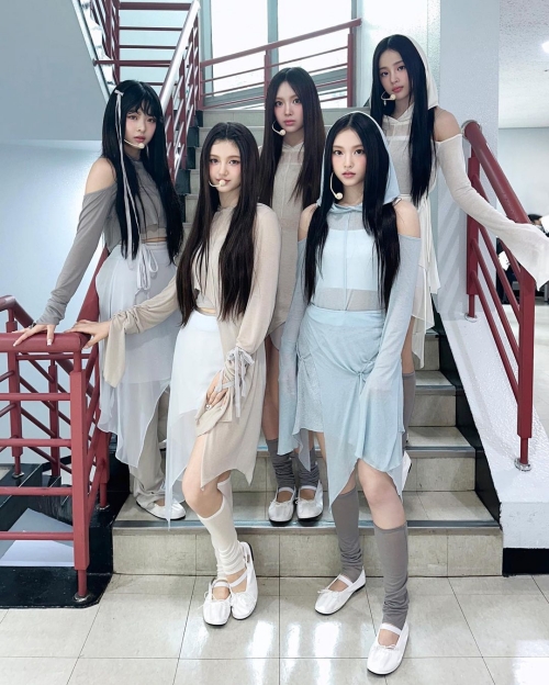 これは音楽番組に出演した際に撮影されたもので、5人は『Cool With You』のステージ衣装を身にまとってポーズを決めている。