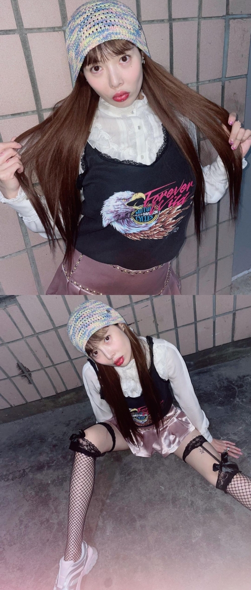 写真をのぞくと、レースのブラウスにサテンのスカート、網タイツのようなレースの靴下を合わせた個性的なファッションを着こなし、バービー人形のようなビジュアルを誇るヒョナの姿が写っている。