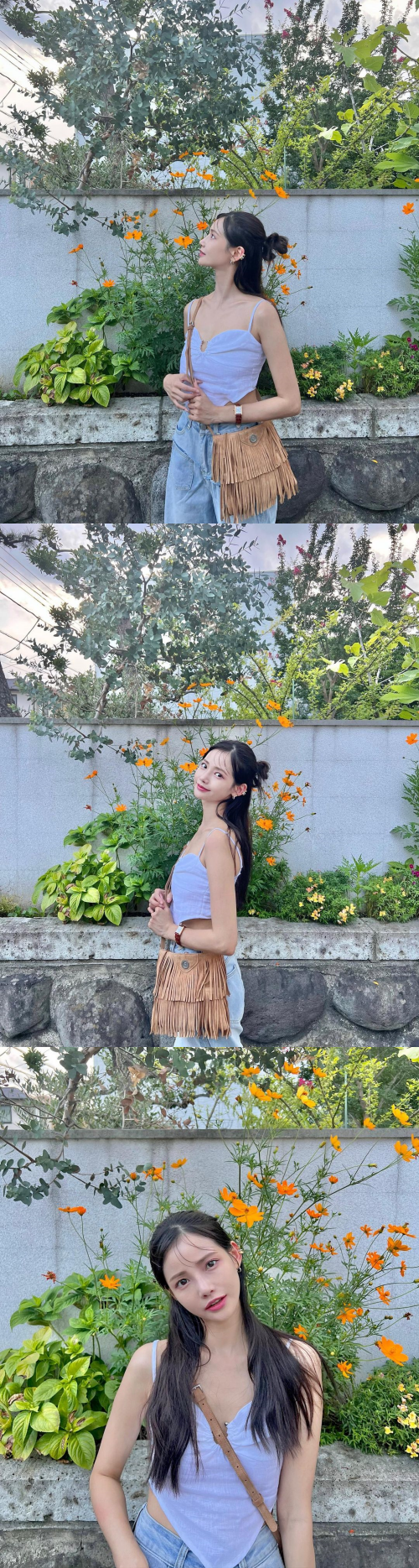 緑の葉っぱや黄色い花などの自然を背景に、写真を撮るハ・ヨンス。キャミソールからは真っ白な細い二の腕があらわになり、相変わらずのスタイルの良さを誇っている。