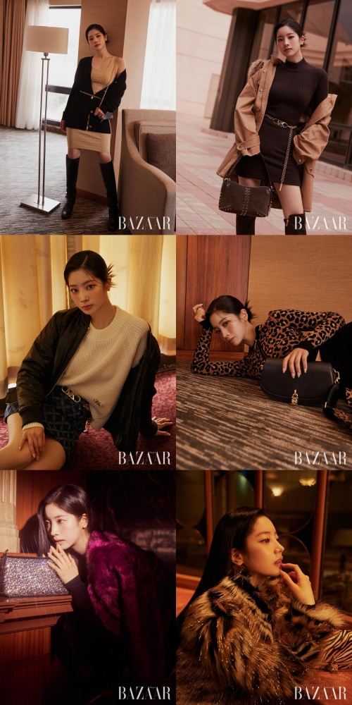 今回の撮影でダヒョンはキルティングボンバージャケットとニットドレスをマッチさせたカジュアルルックを披露。また、ミニドレスにチェーンベルトを合わせたブラックカーディガンでルーズな着こなしたトレンディーなスタイリングを提案している。