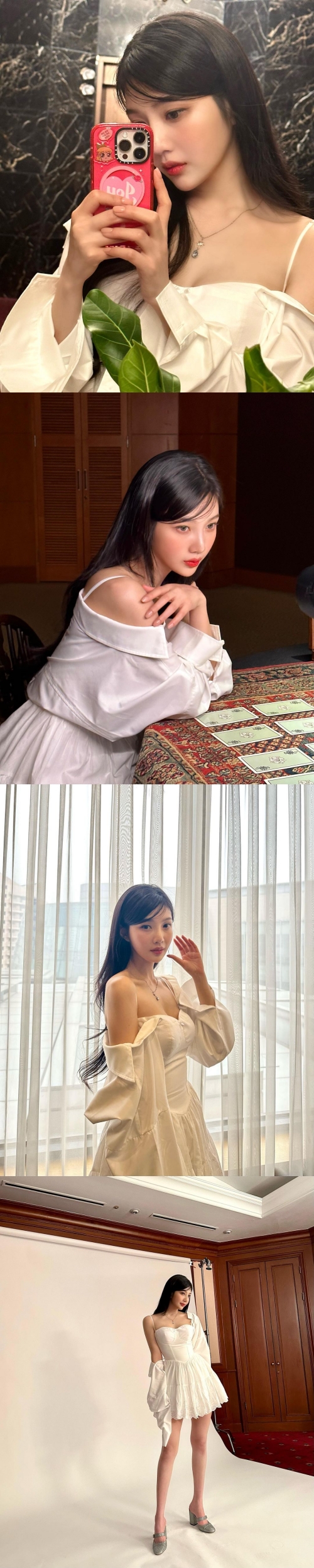 純白のオフショルダーミニドレスを着用して均整のとれたスタイルを披露。すらりと伸びた脚線美で見る者を圧倒した。