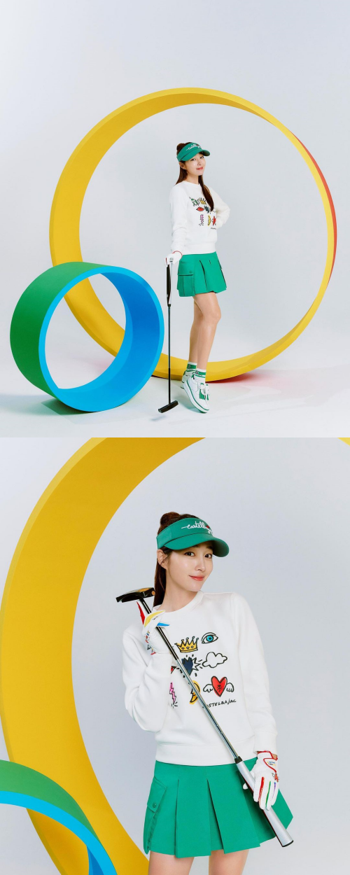 写真には、ゴルフウェアを着たイ・ミンジョンの姿が。緑のアイテムで爽やかな印象を与えたイ・ミンジョン。ミニスカートからは艶めく美脚が伸びている。