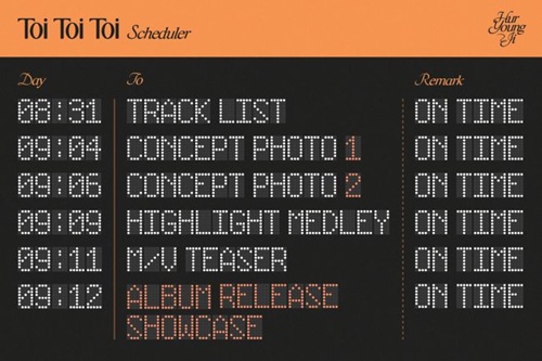 8月30日、ホ・ヨンジ1stシングル『Toi Toi Toi』のスケジュールイメージが公開された。今回のシングルでソロアーティストとしての第一歩を踏み出す彼女は、空港のスケジュールボードのようなイメージで胸がときめく旅の始まりを知らせた。