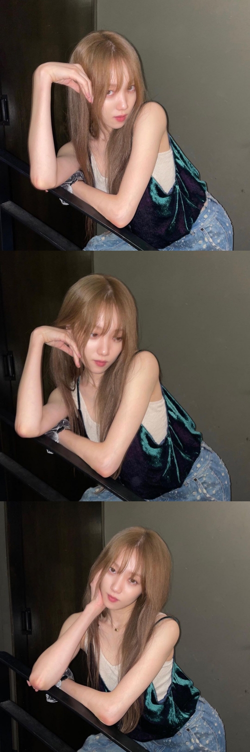 タンクトップにデニムを合わせたカジュアルな装いで、以前よりも明るくなった髪色がイ・ソンギョンのエキゾチックなビジュアルを際立たせている。