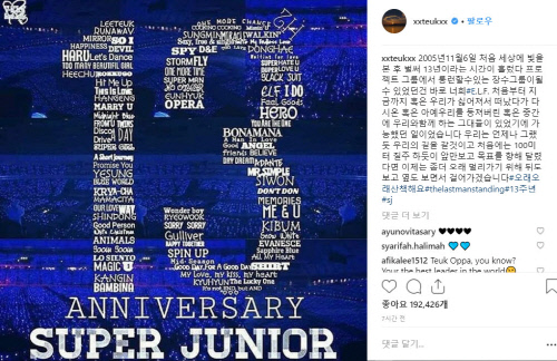 SUPER JUNIORのリーダー・イトゥクは、11月6日に自身のインスタグラムに長文のメッセージを掲載。デビュー13周年を記念する祝いの言葉と感想を残した。