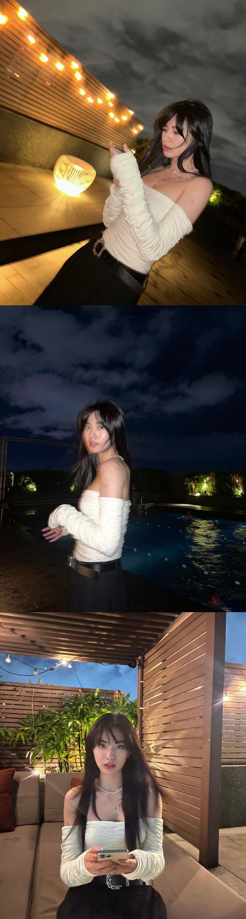 公開された写真のには、肩があらわになったオフショルダーのトップスに黒のパンツをマッチさせたナナの姿が収められている。