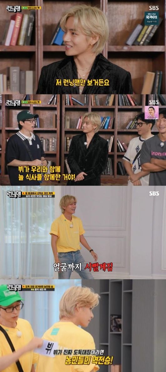 『ランニングマン』の大ファンであると告白したVは、「ご飯を食べる時は『ランニングマン』しか見ない」として「ご飯のお供はランニングマン」と発言して注目を集めた。そしてVが一番会いたかったメンバーにハハを挙げると、ハハは「Vが私を見ながら話すと、とてもときめく」と感想を伝えた。