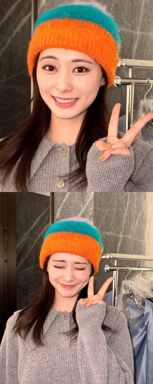 オレンジのニット帽を被ったツウィはピースをしながらお茶目な笑みを浮かべており、2枚目のカットでは眉をしかめて満面の笑みを見せている。
