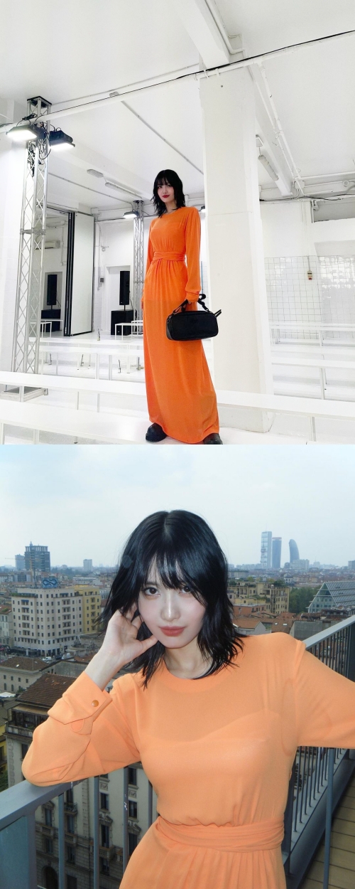 鮮やかなオレンジカラーが眩しいシースルードレス姿のモモ。小物は黒でまとめてスタイリッシュな雰囲気を見せつけている。