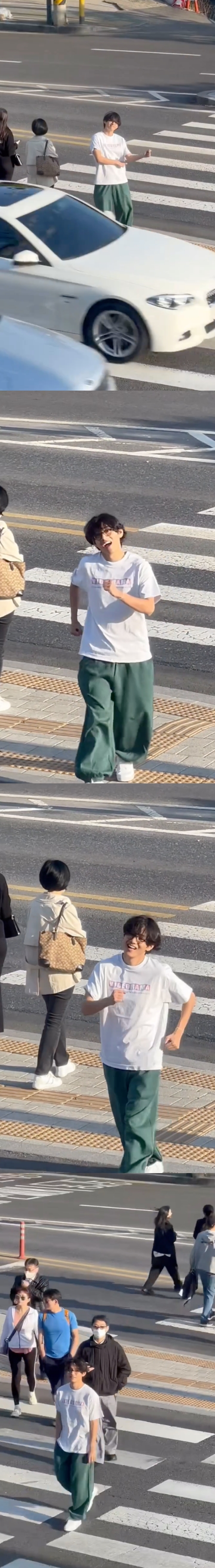 公開された動画をのぞくと、横断歩道を待つVの姿が。体を揺らしながら愉快にステップを踏んで視線を捉えた。