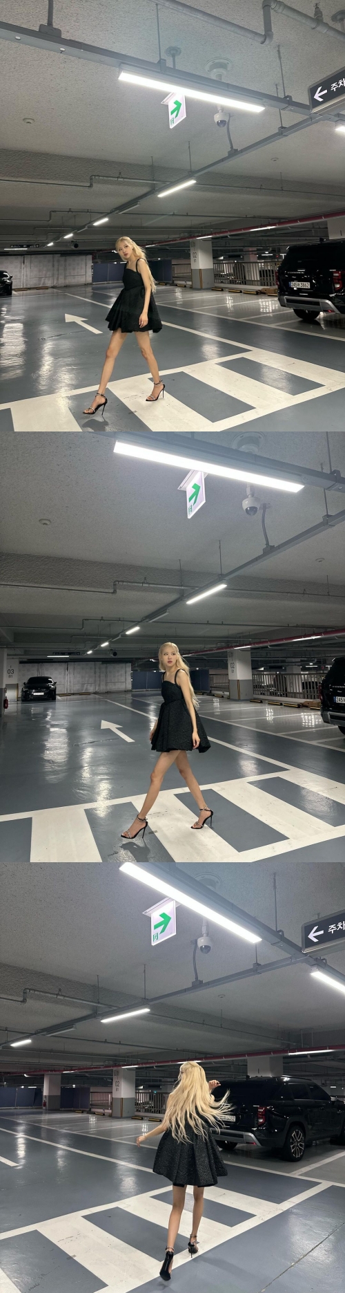 駐車場がランウェイと錯覚するほどの、ロゼの華やかなビジュアルと強いオーラが印象的だ。