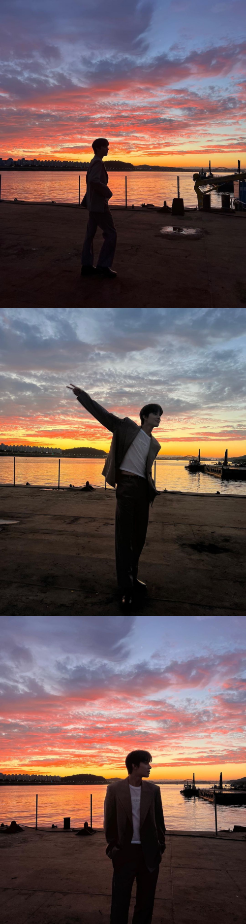 写真には海辺で佇むジョンウの姿が収められている。ポケットに手を入れたり、ピースをしたりと、様々なポーズを取っている。夕焼けに照らされて表情はわかりにくいものの、立っているだけでも絵になるオーラだ。