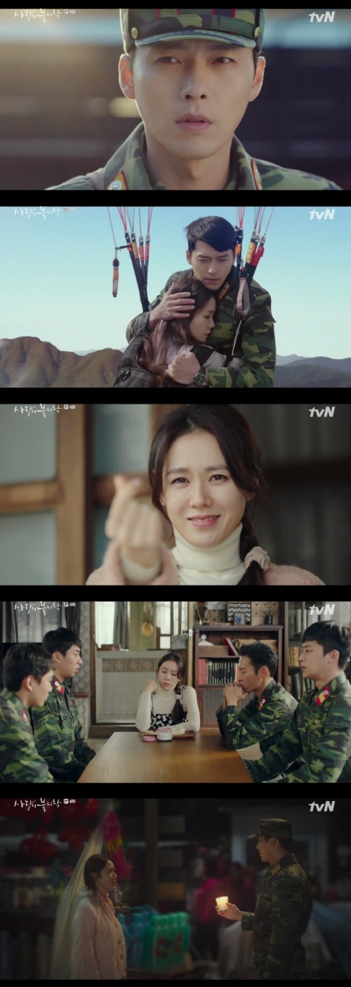 ユン・セリは、持っていた無線機の周波数が見つかって偵察隊に追われるも、彼女を追いかけて来たリ・ジョンヒョク(演者ヒョンビン)と一緒にパラグライダーに乗って崖の下に落ち、危機を逃れた。
