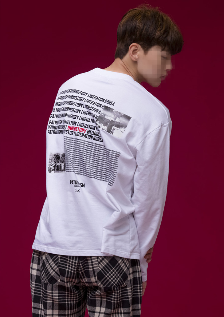 JIMINが着用したそのTシャツには、原子爆弾が爆発する写真と、日本統治解放を迎えた韓国人の写真、「Liberation(光復)」「Our History(私たちの歴史)」「Patriotism(愛国心)」などのフレーズがプリントされている。