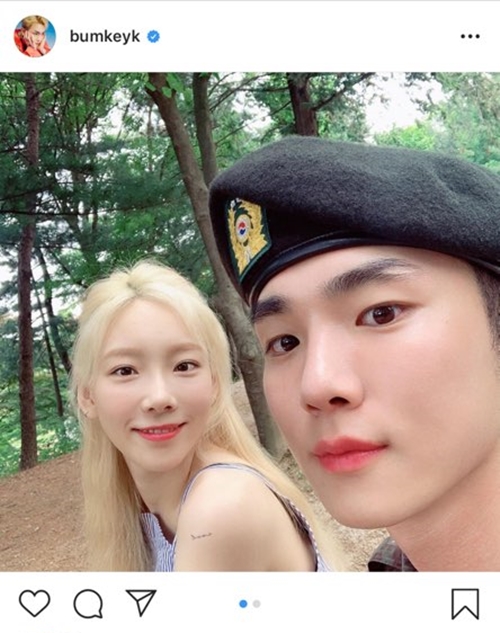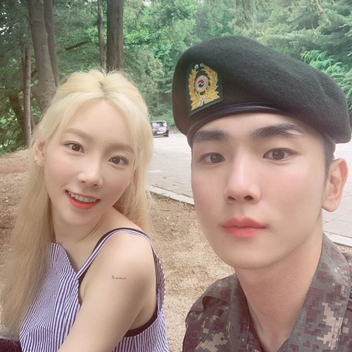 キーの投稿した写真は、昨年の夏に撮影したもの。軍服に身を包んだキーと、華やかな金髪が目を引くテヨンが笑顔でカメラを見つめている。