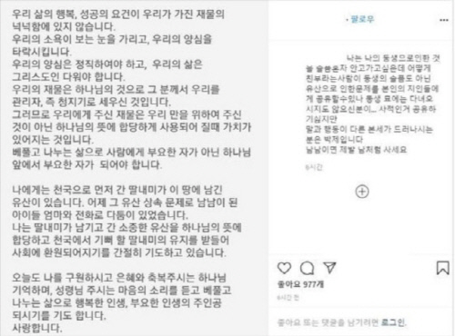 また、「私は娘が残した大切な遺産を神様の意思に合致し、天国で喜ぶ娘の遺志を受け継ぎ、社会に還元されることを心から祈っている」と説明した。