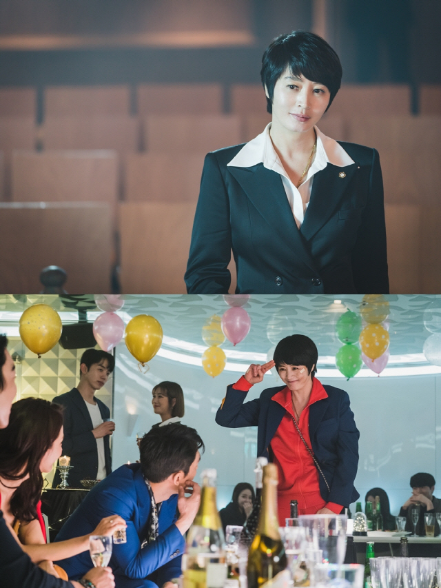 今回公開されたスチール写真には、胸元に弁護士バッジをつけて余裕に満ちた表情を浮かべたチョン・グムジャ役のキム・ヘスが写っている。一方で、顔には絆創膏を貼り、赤いジャージにジャケットを羽織って図々しく笑う姿も写っており、はたしてどんなキャラクターか興味をそそる。