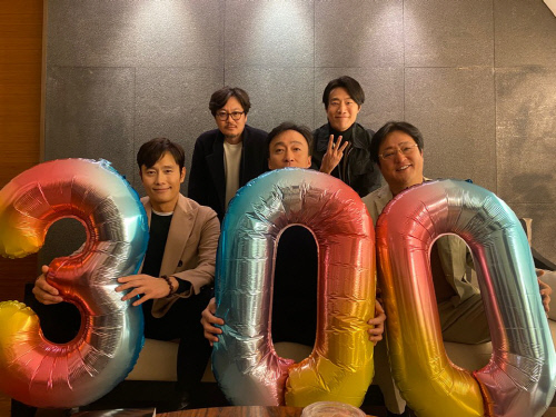 イ・ビョンホンをはじめ、イ・ソンミン、クァク・ドウォン、イ・ヒジュン、ウ・ミンホ監督が「300」という数字の風船と共にカメラに向けて微笑み、感謝を伝えている。