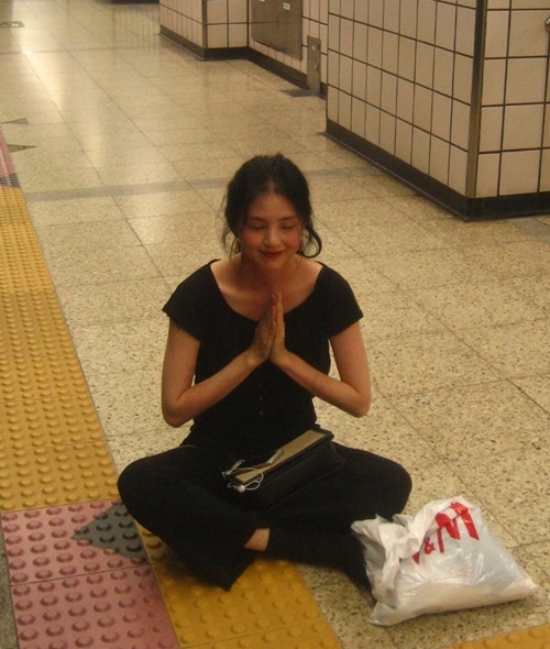 また、ほかの写真では赤い顔で地下鉄のホームに座り込んで合掌する姿が盛り込まれ、笑いを誘った。