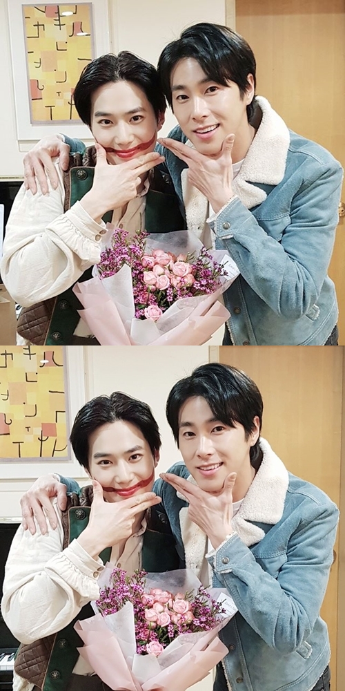 別の投稿では、EXOスホが主演を務める『笑う男』の公演に足を運んだユンホの姿が公開された。2人は仲睦まじげに肩を組み、同じポーズで笑顔を見せている。