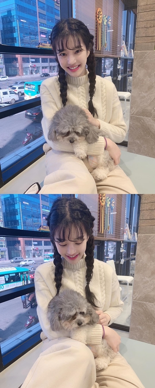 写真の中のイ・ユビは、小型犬を抱いて優しく微笑んでいる。白で統一されたコーディネートや三つ編みのヘアスタイルが、一層清純な魅力を感じさせる。