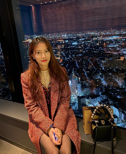 ギュリは、2月6日にインスタグラムを更新。投稿された写真には、夜景を背景に微笑むギュリの姿が写る。レース地のトップスとツイード素材の赤いコートは、一層エレガントな魅力を強調している。